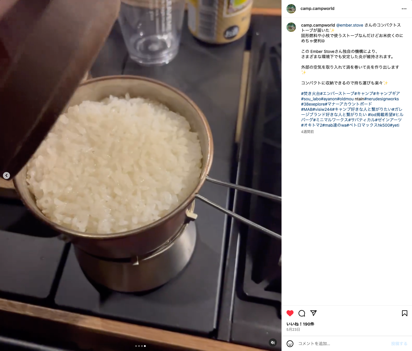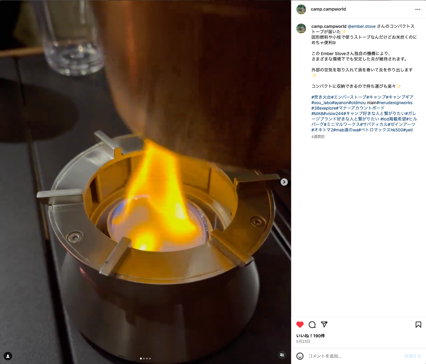 また30 g までの固形燃料のほとんども使用することができ、小枝を使うよりさらに燃えかすが少なくなります。キャンプや登山などゴミを捨てられない環境でも活躍します。
